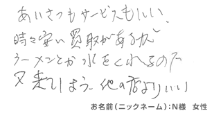 8月 - あいさつもサービスもいい。時々安い買取があるが、ラーメンとか水をくれるので、又来てしまう、他の店よりいい。